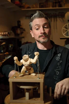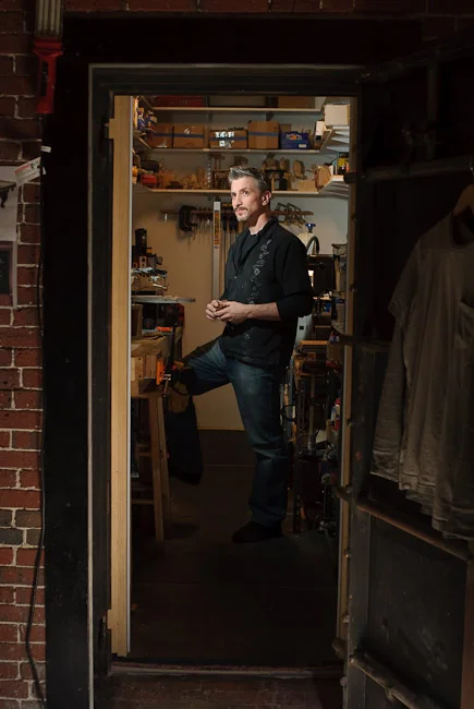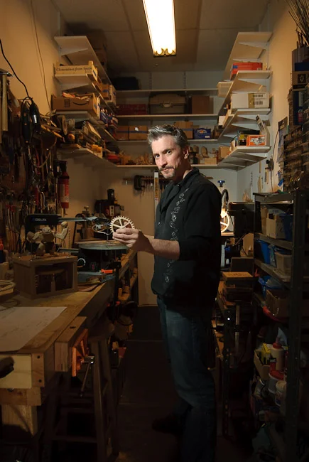 My friend Suzzanne Cromwell of the Cultural Organization of Lowell recently introduced me to Dug North, and what a find! Dug is an artisan who creates "automated wooden sculpture", or automata. This was a really fun shoot because in his home, at Lowell's Ayer Lofts, he has his very own vault! Apparently, the building was once a patent medicine company, and the vault was used to store who-knows-what...cash, drugs, poison? In those days were the latter two different? Today, Dug uses it as his workshop, allowing him to work at any hour without disturbing his neighbors. Plus it's very cool!